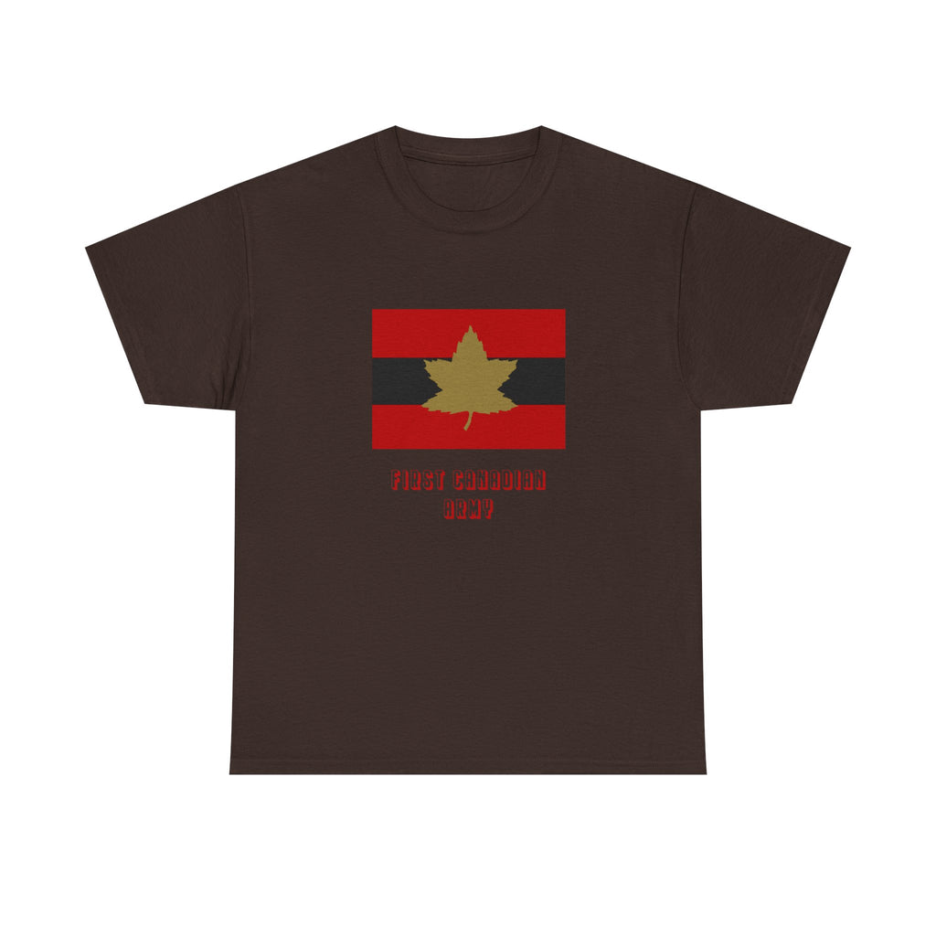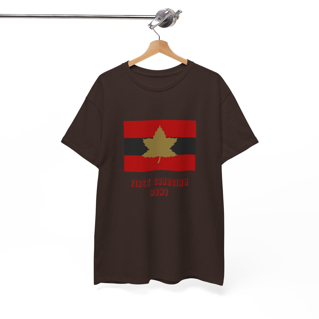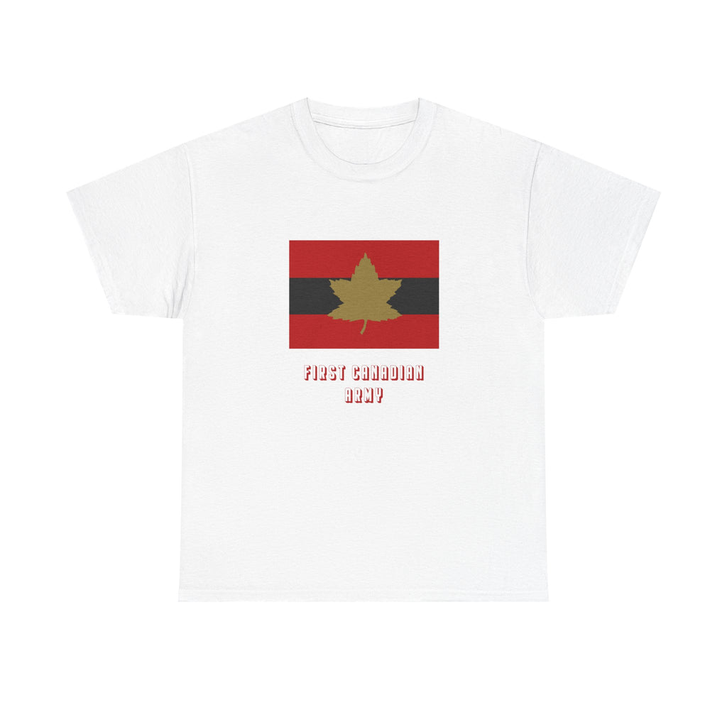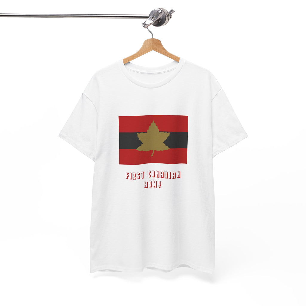 This First Canadian Army T-shirt features the official formation sign — a red flag with a black horizontal bar and a gold maple leaf — used to identify vehicles and equipment of the First Canadian Army during the Second World War.