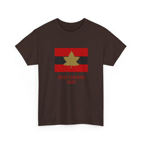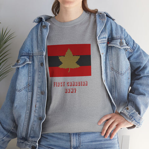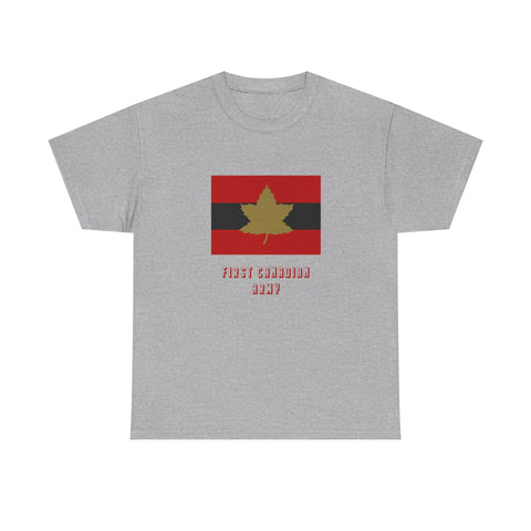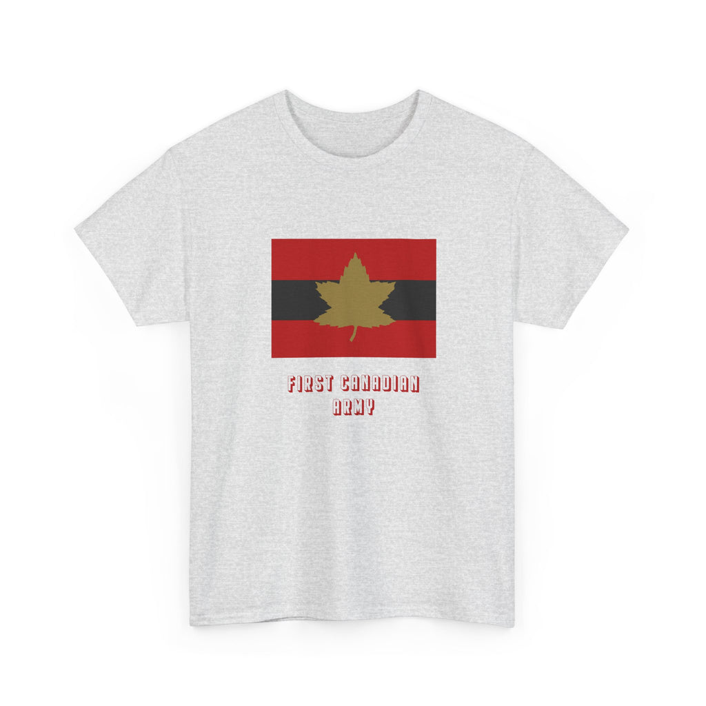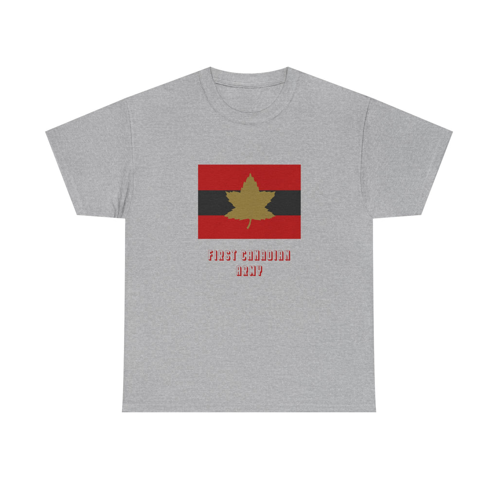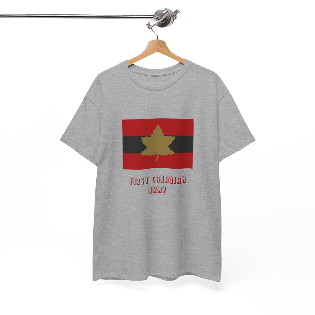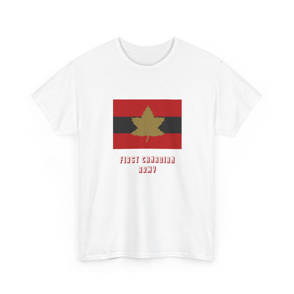 This First Canadian Army T-shirt features the official formation sign — a red flag with a black horizontal bar and a gold maple leaf — used to identify vehicles and equipment of the First Canadian Army during the Second World War.