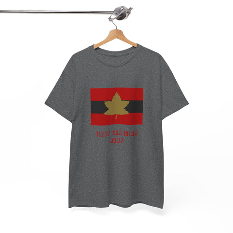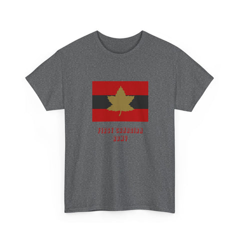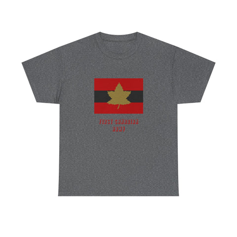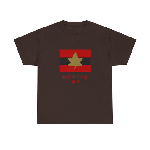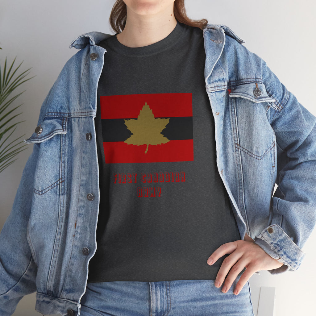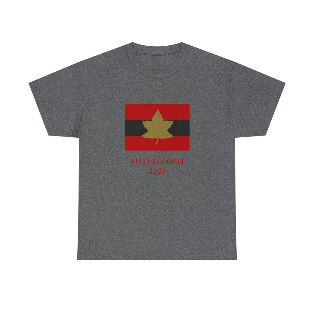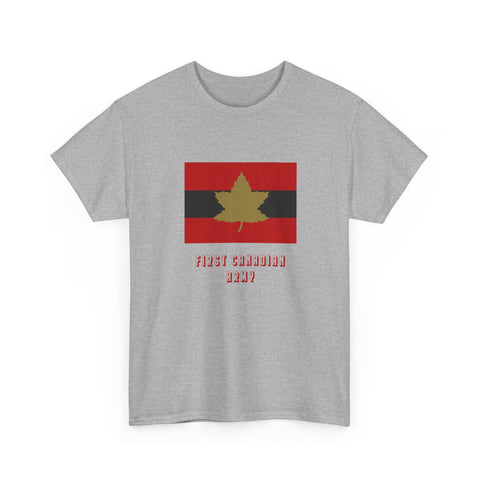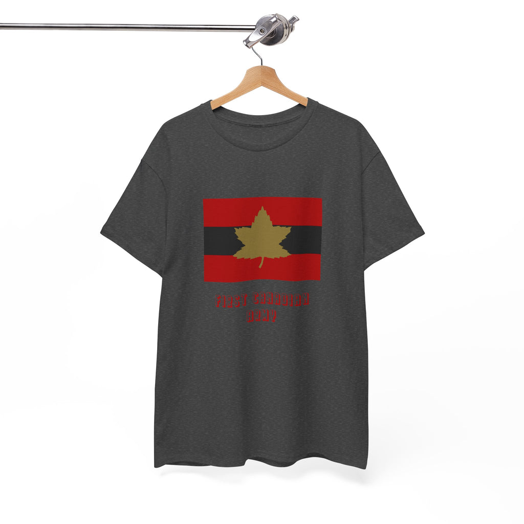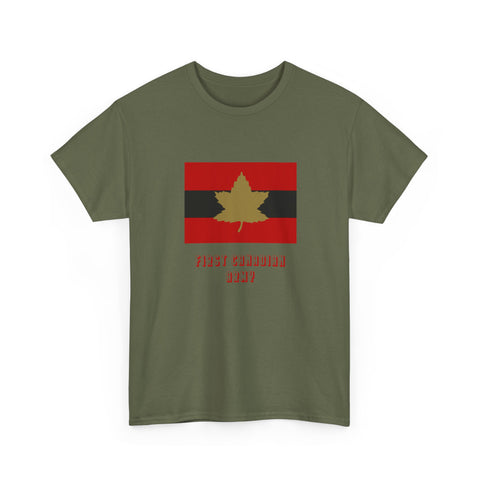 This First Canadian Army T-shirt features the official formation sign — a red flag with a black horizontal bar and a gold maple leaf — used to identify vehicles and equipment of the First Canadian Army during the Second World War.