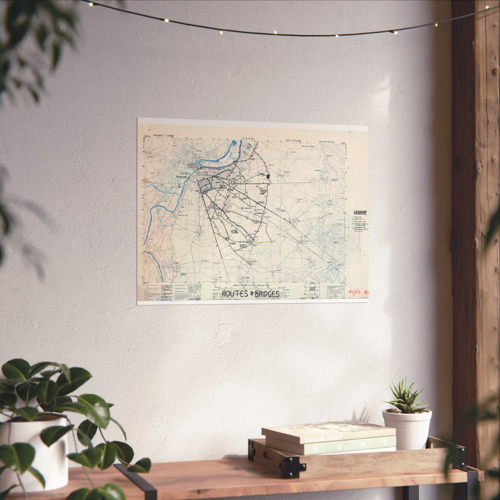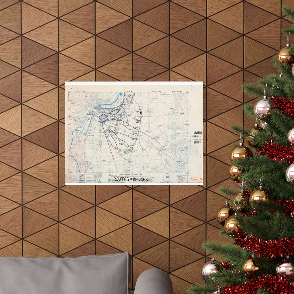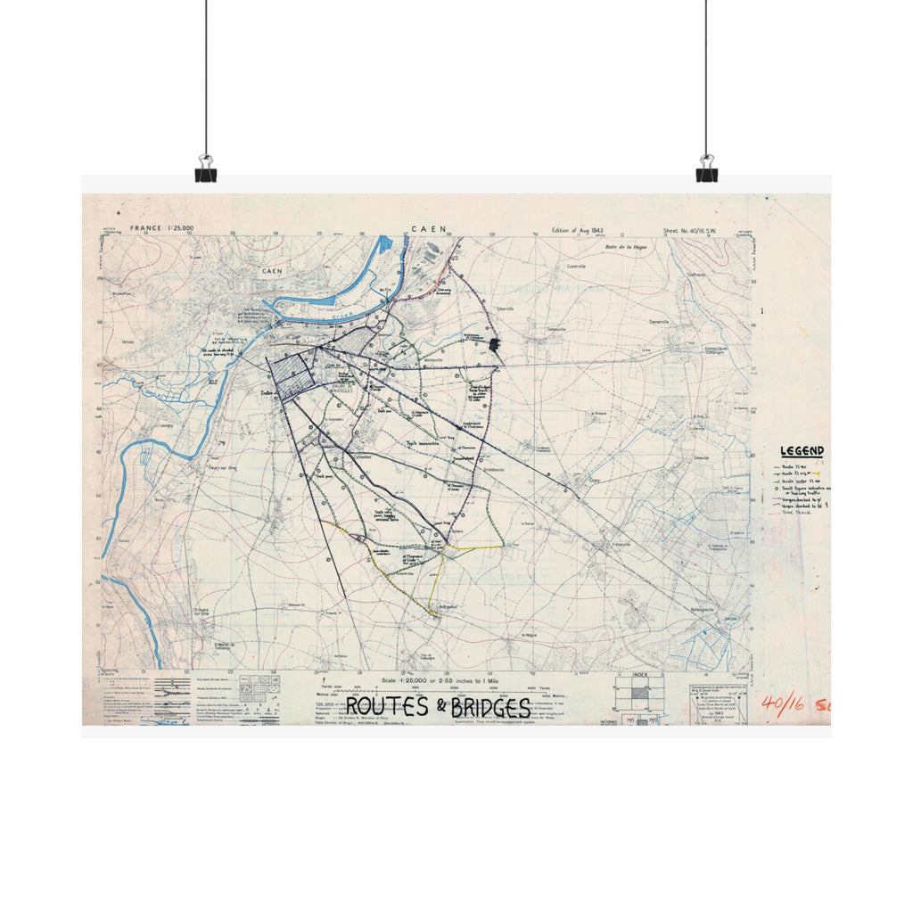 A faithful reproduction of the Caen Routes & Bridges overprint—a precise record of the infrastructure assessments that underpinned Allied operational planning in the Normandy theatre.