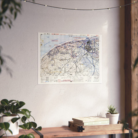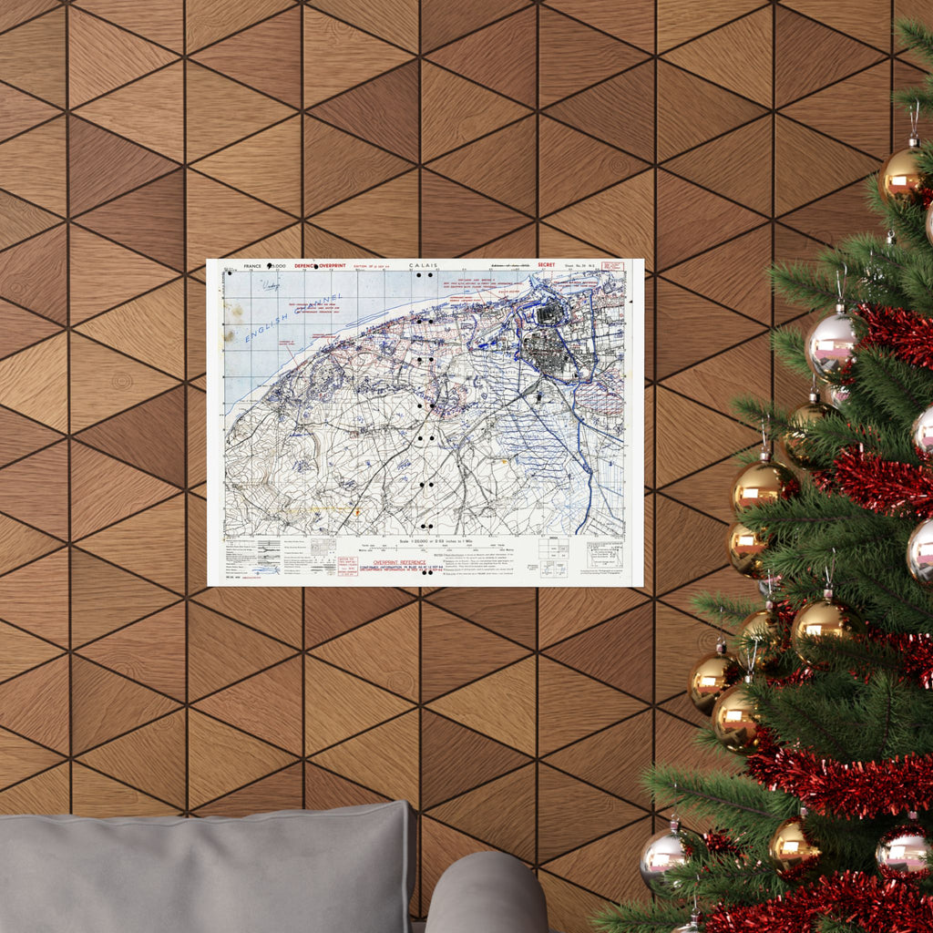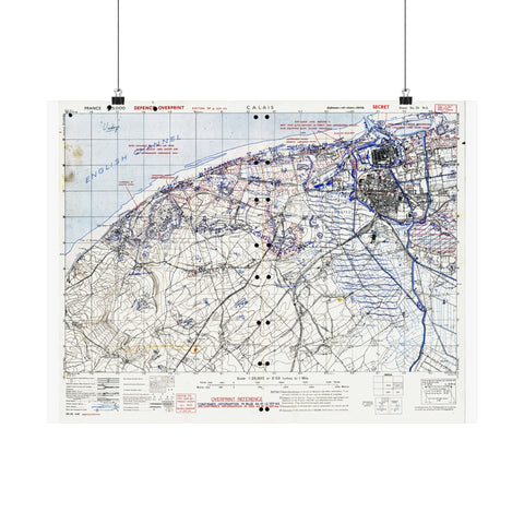 This remarkable reproduction captures an original “Defence Overprint” map of Calais, created in 1944 to aid Canadian forces during Operation Undergo — the assault on the heavily fortified port city guarding the French coast opposite Dover.