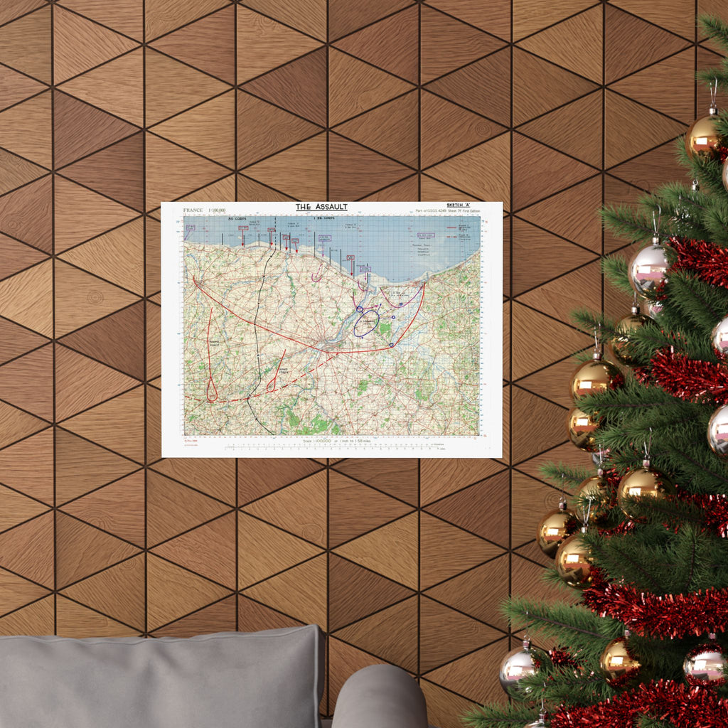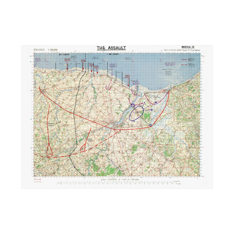 This map illustrates the preliminary plan for D-Day as prepared for the Second British Army, including the 3rd Canadian Infantry Division. Covering the Gold, Juno, and Sword sectors of the Normandy coastline, it outlines the intended landing zones and objectives for the end of the first day of battle.